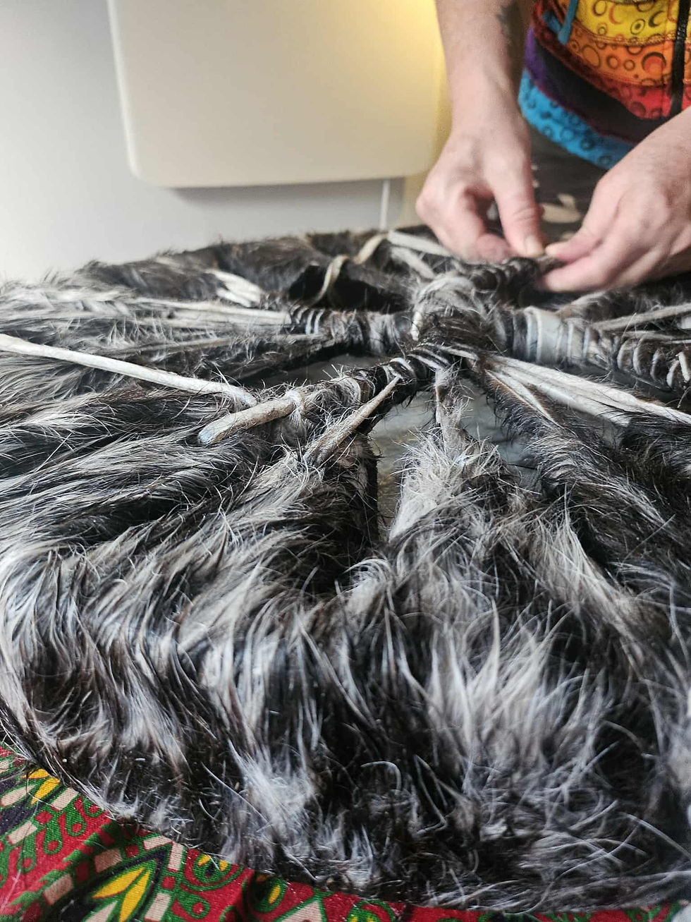 We worked together to complete the process of birthing Bea. The hide is very thick in places and the hairs made it tricky in places to thread it through, we needed to really tug to get the strap through the holes at times.